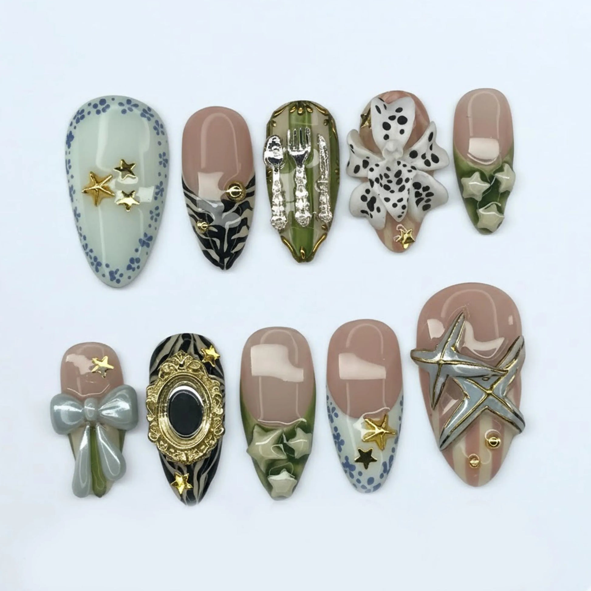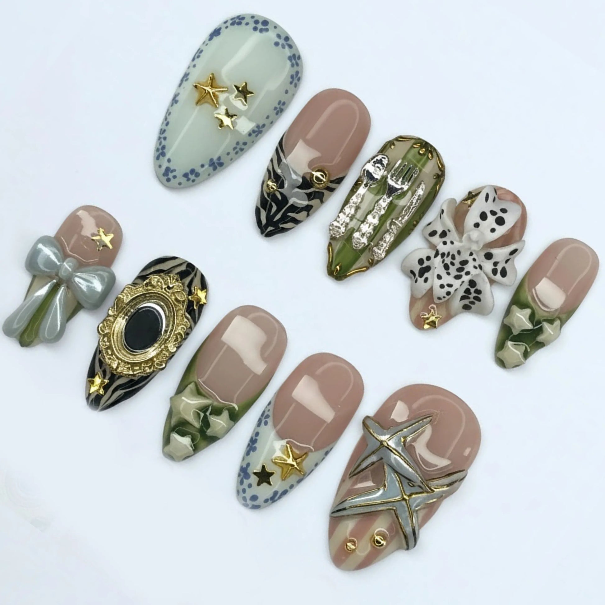 Make a bold statement with our Vintage Luxury 3D Press On Nail Set, featuring hand-painted designs with gold stars, zebra prints, bows, and intricate 3D art details.