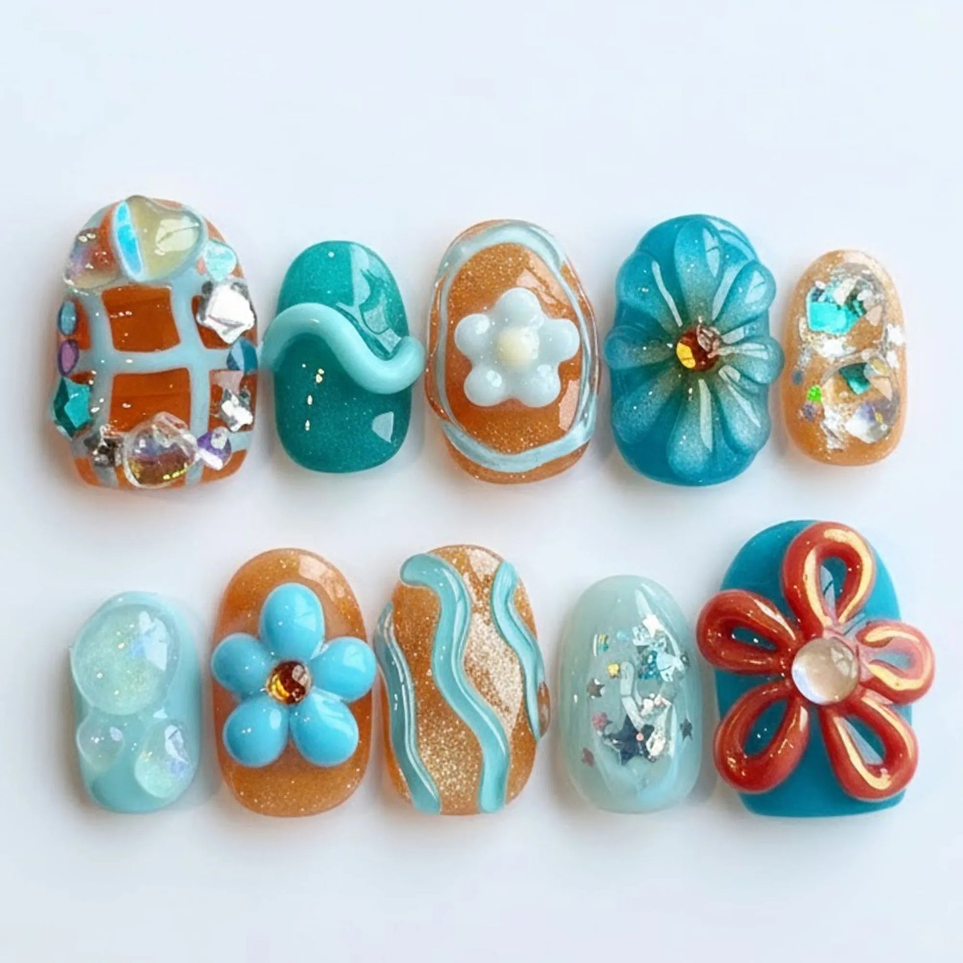 Dive into a splash of vibrant color and playful design with our unique 'Ocean & Sunset' inspired press-on nail set! ☀️ This lively collection blends refreshing teals and brilliant oranges, adorned with eye-catching 3D elements and sparkling accents, perfect for adding a burst of fun to your look.