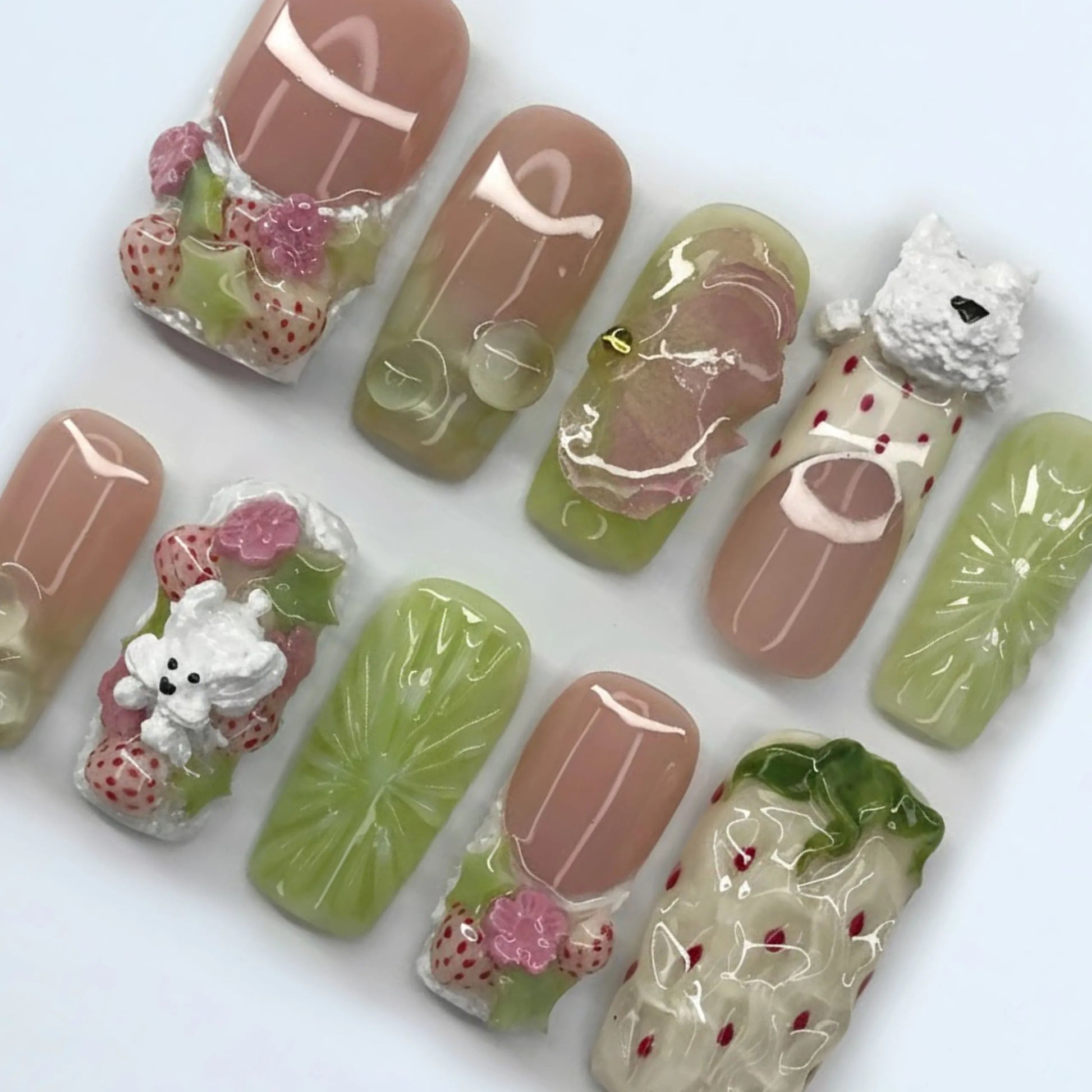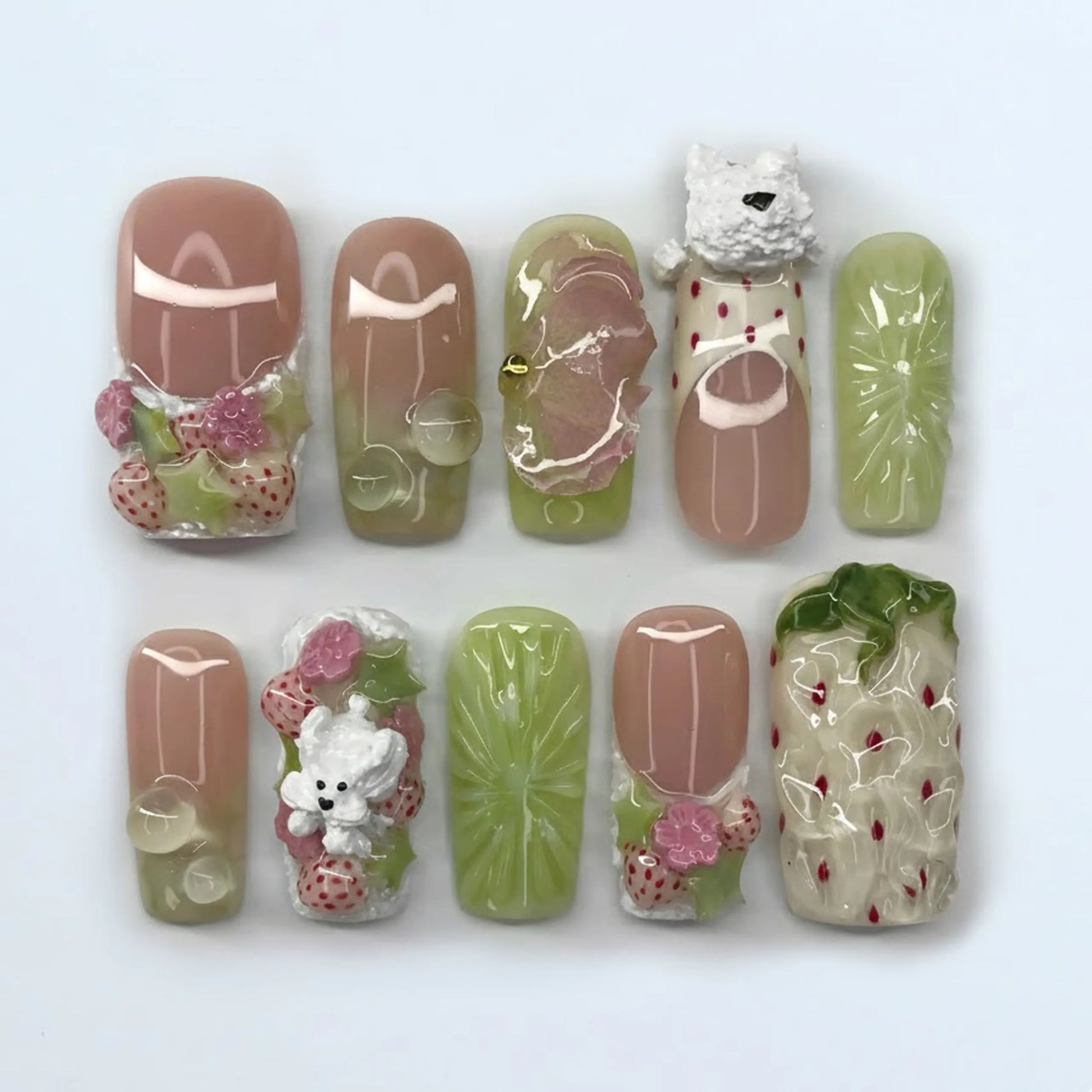 Add sweetness to your look with our Strawberry Puppy 3D Press On Nail Set, featuring adorable hand-sculpted strawberries, flowers, and a tiny white puppy.
