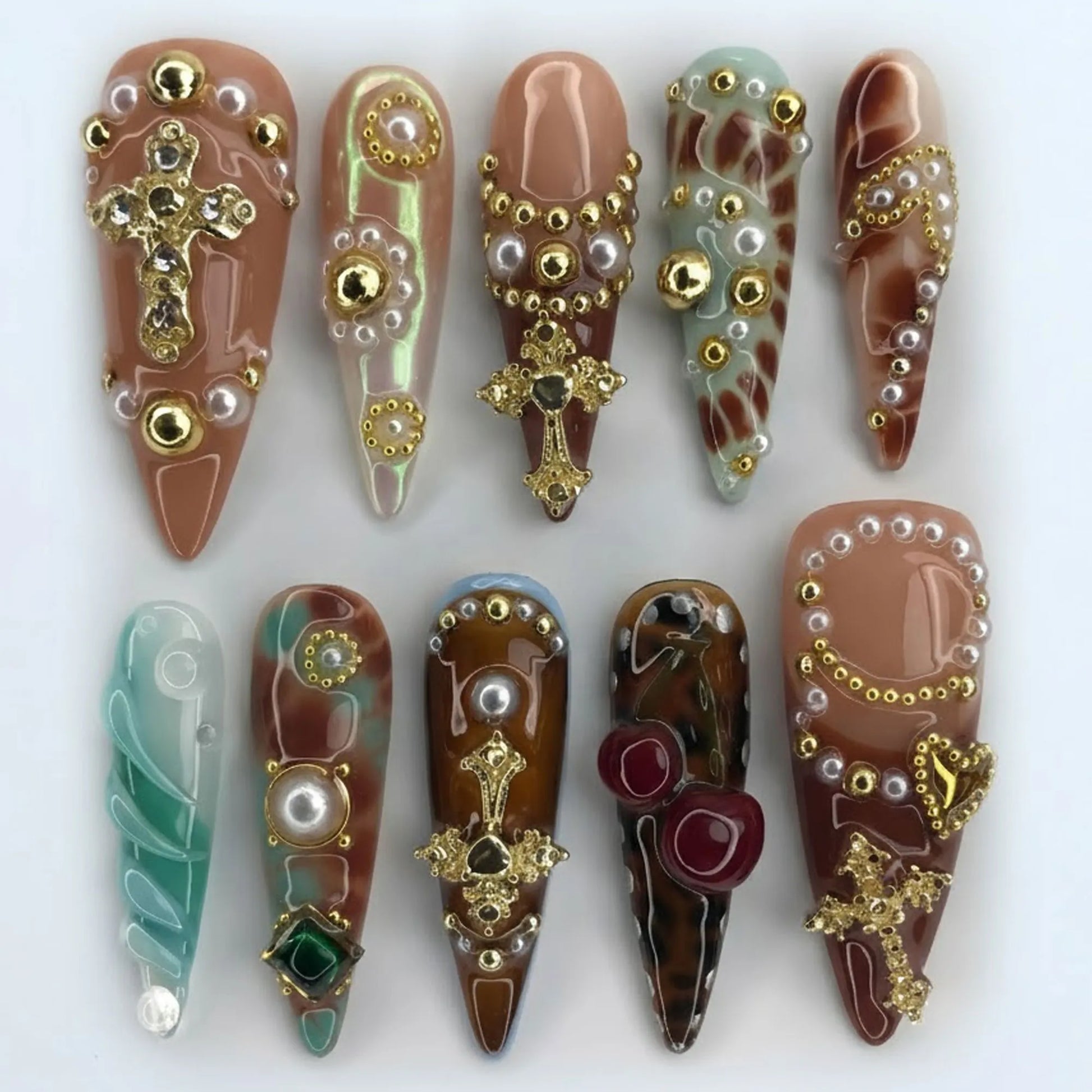 Unique 3D Sculptural Elements:Includes sculpted hearts, abstract swirls, and gemstone-like accents that add depth and dimension to each nail.