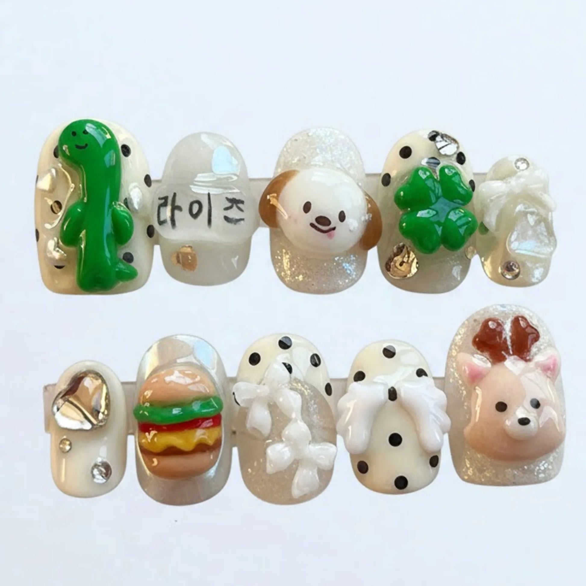 Irresistible Kawaii Characters:Each nail is a miniature world, featuring adorable 3D characters like a cute dog, a happy green dinosaur, and a sweet bear, bringing endless smiles.